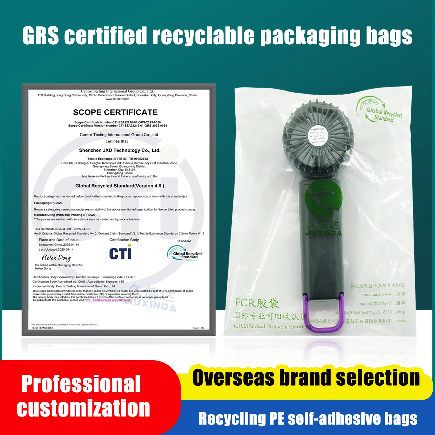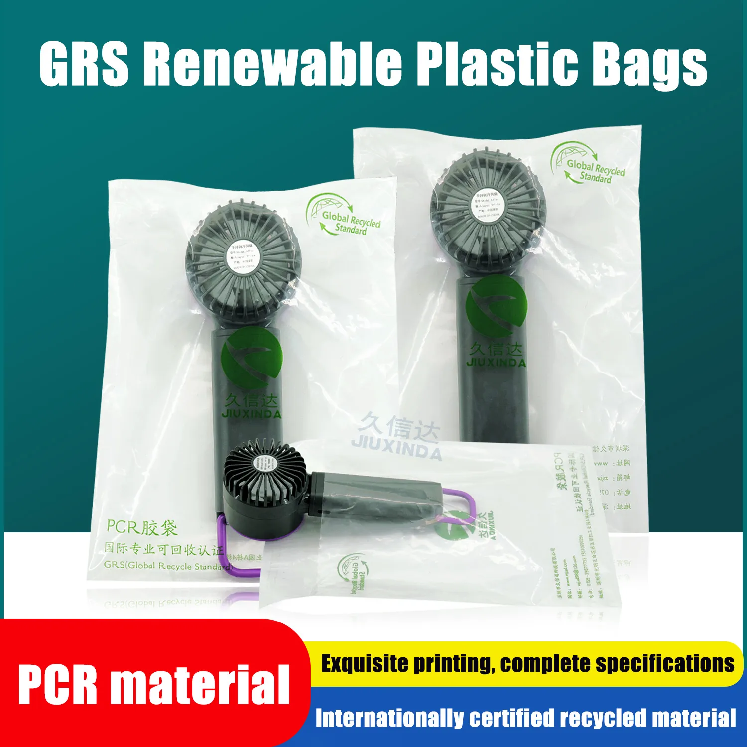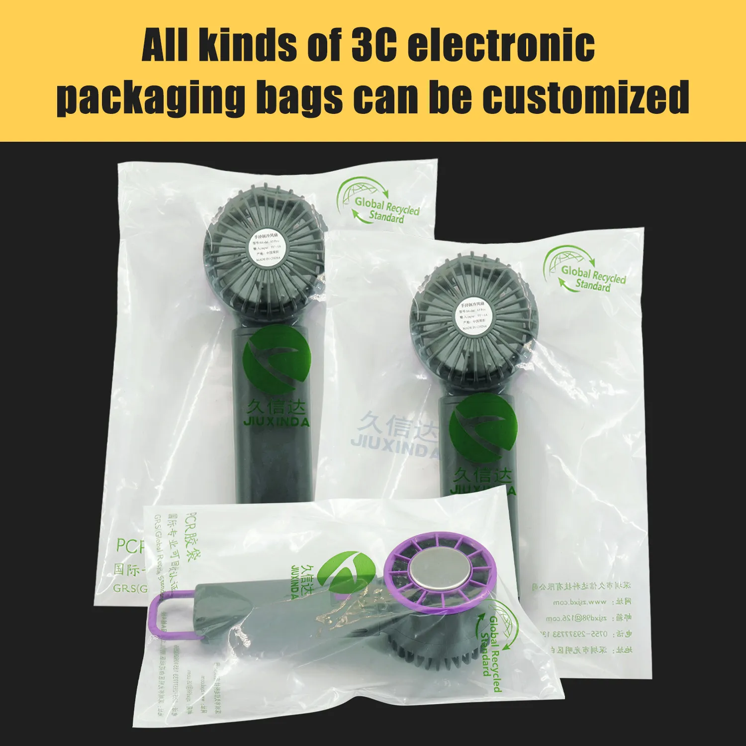 The fan packaging is made of recyclable PE plastic bags, GRS certified. Product application: packaging for fans, handheld small fans, desktop fans, fan accessories and other portable household appliances.